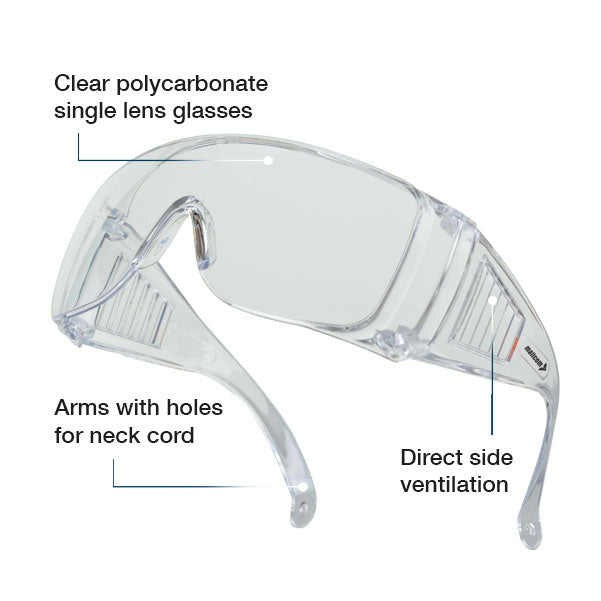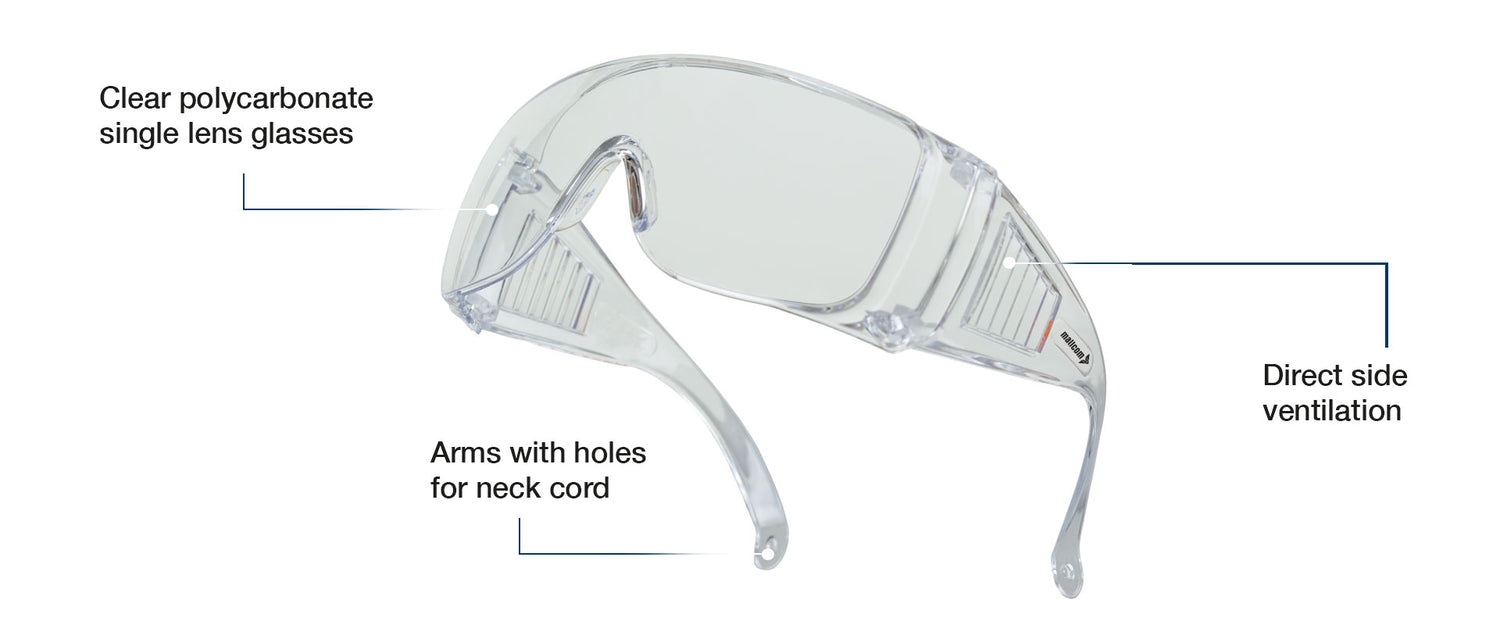 - Spectacles having clear Polycarbonate single lens glasses with direct side ventilation