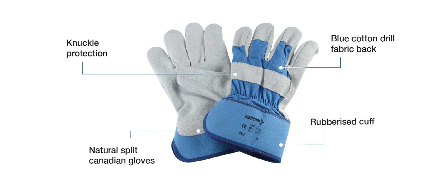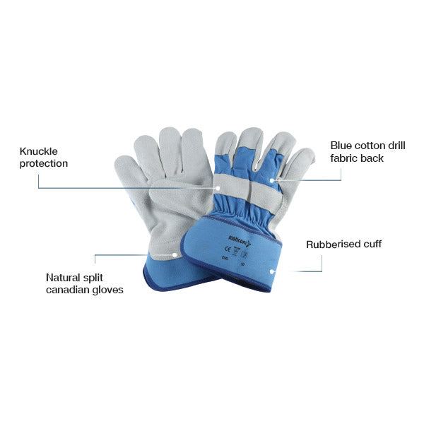 DURABLE PROTECTION WITH CANADIAN CRAFTSMANSHIP - These Canadian gloves feature natural split leather, offering durability and reliability in various work environments. With a dyed blue cotton drill back and cotton lining, they ensure comfort during extended wear. The rubberized cuff and knuckle reinforcement provide added protection, making them suitable for rugged tasks