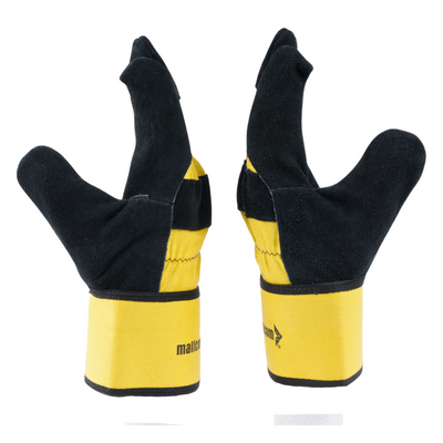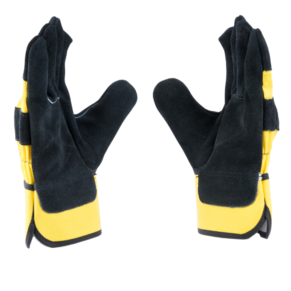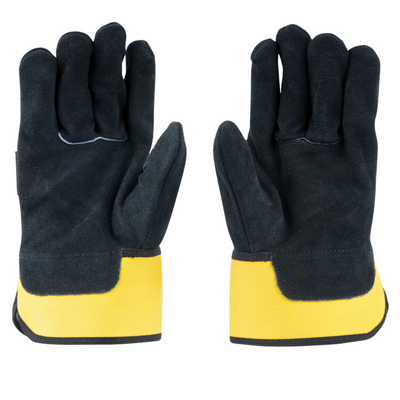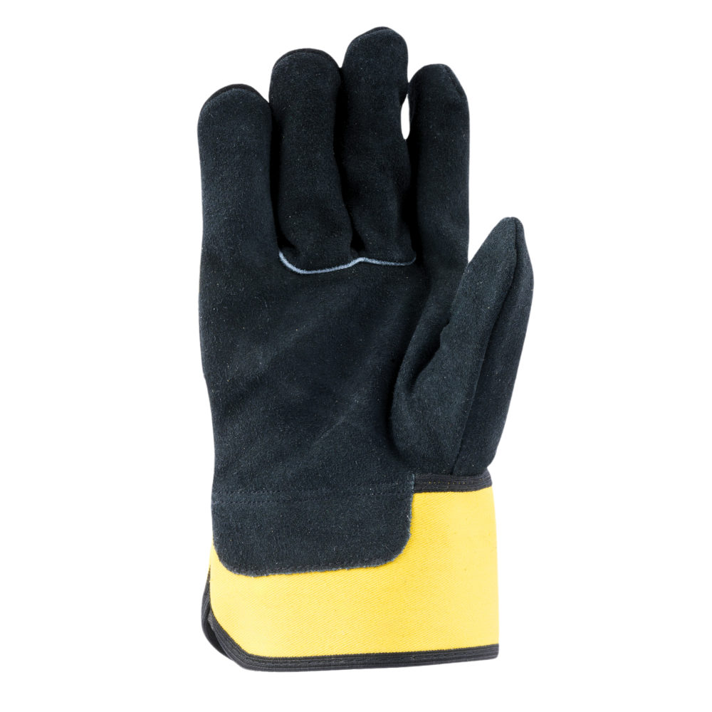 Palm: The palm is made of black split leather, providing durability and abrasion resistance, essential for handling various materials and tools.