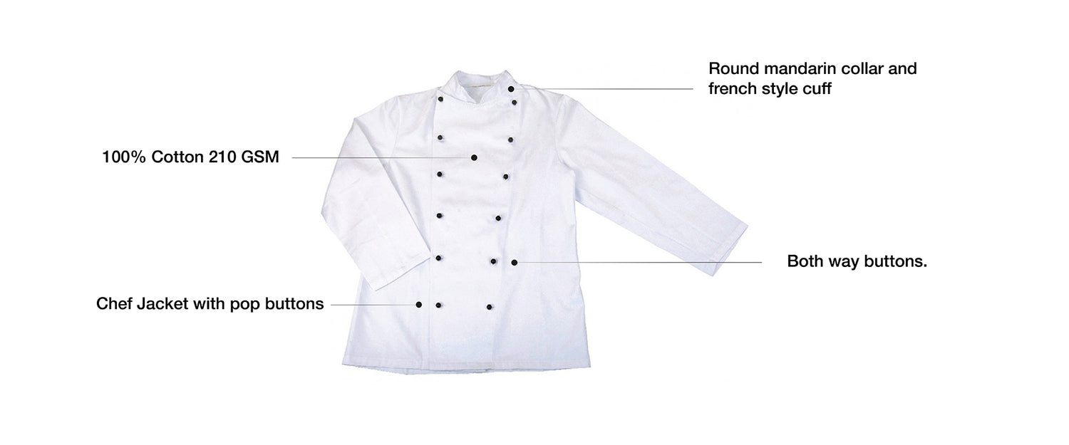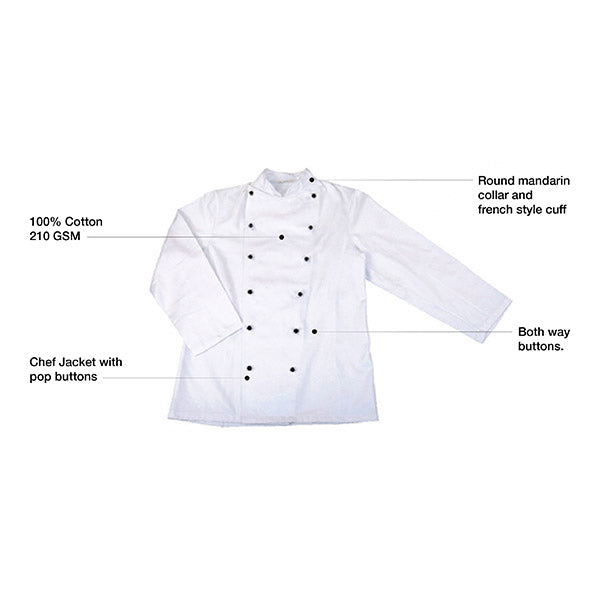 - 100% Cotton 210 GSM Chef Jacket with pop buttons Both way buttons.
