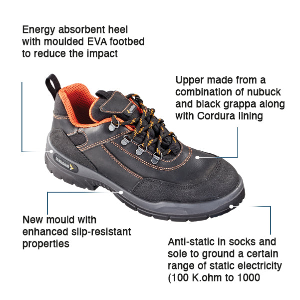 - Low ankle leather shoe made for all major floor work to protect from extreme conditions such as static electric shocks, energy release, and oil