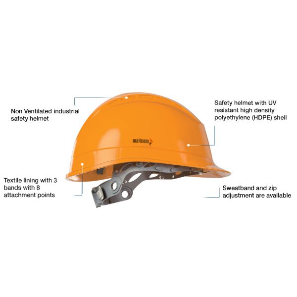 - Safety helmet with UV resistant high-density polyethylene (HDPE) shell