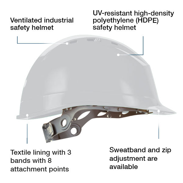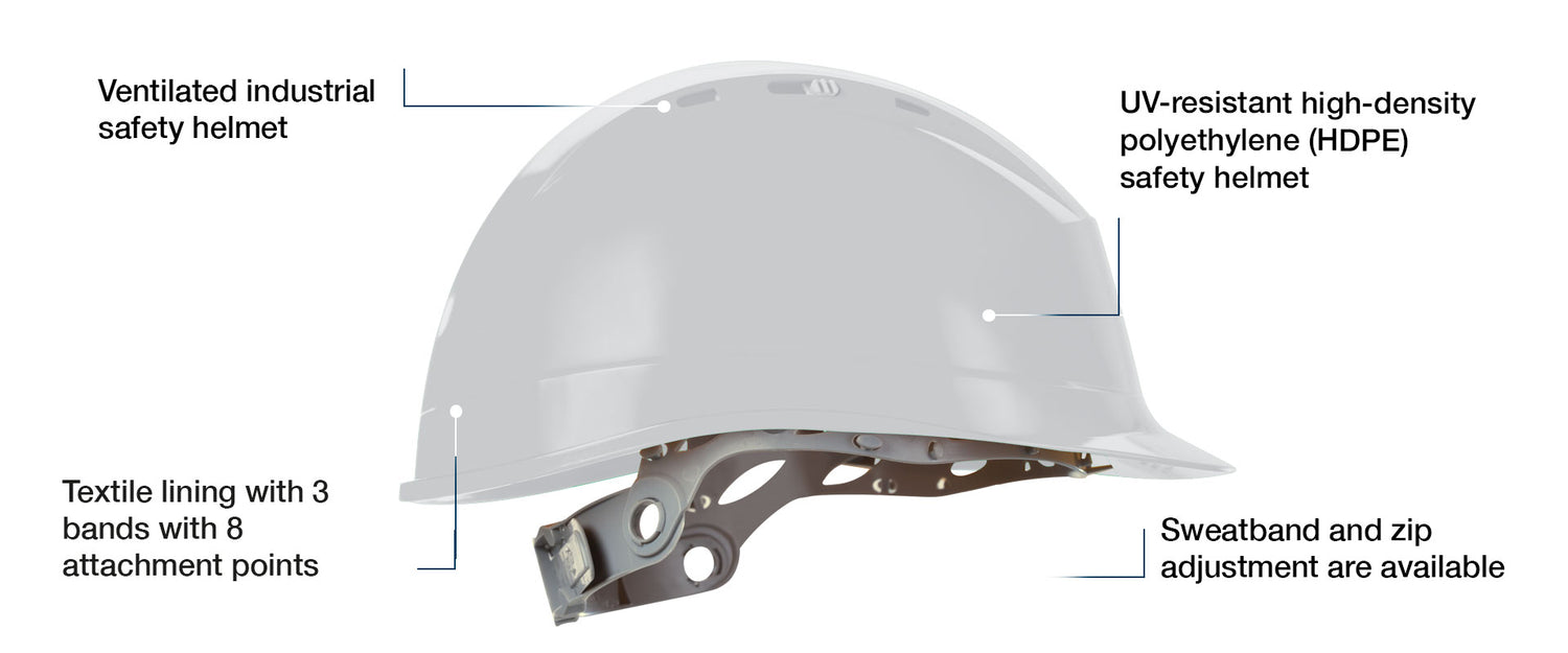 - Safety helmet with UV resistant high density polyethylene (HDPE) shell
