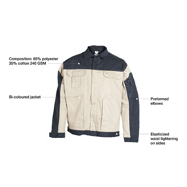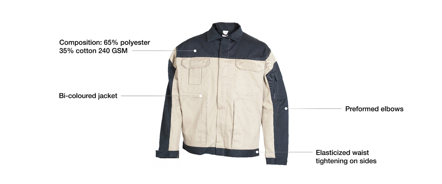 - Composition: 65% polyester 35% cotton 240 GSM Bi-coloured jacket Elasticized waist tightening on sides Preformed elbows 5 pockets