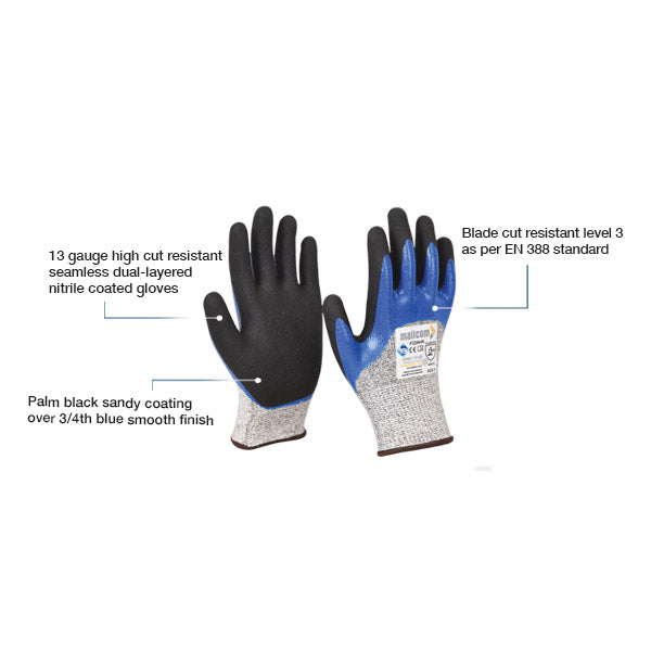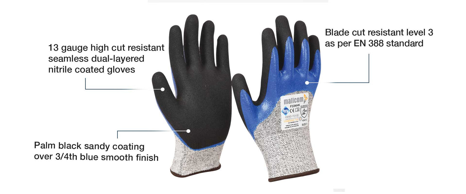 - 13 gauge gloves are made with UHMWPE based blended yarn and a Nitrile coated palm and finger tips offer increased grip, chemical & mechanical resistance.