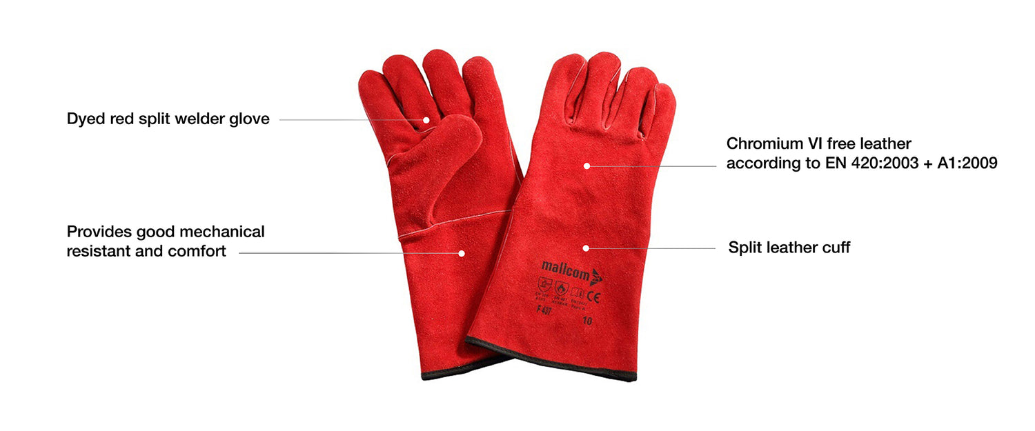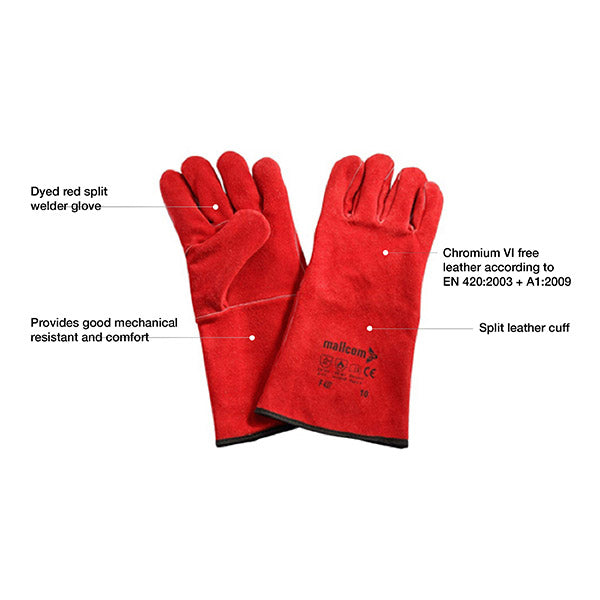 RED SPLIT LEATHER WELDER GLOVES - Welder gloves play a pivotal role in ensuring safety and protection for individuals working in environments prone to heat, sparks, and flames. Among the array of options available, red split leather welder gloves stand out for their robust features and durable construction. Crafted with meticulous attention to detail, these gloves offer a combination of functionality and comfort, making them indispensable for welders and professionals working in similar industries. It has inner cotton fleece lining, 14 cm cloth-lined cuff.