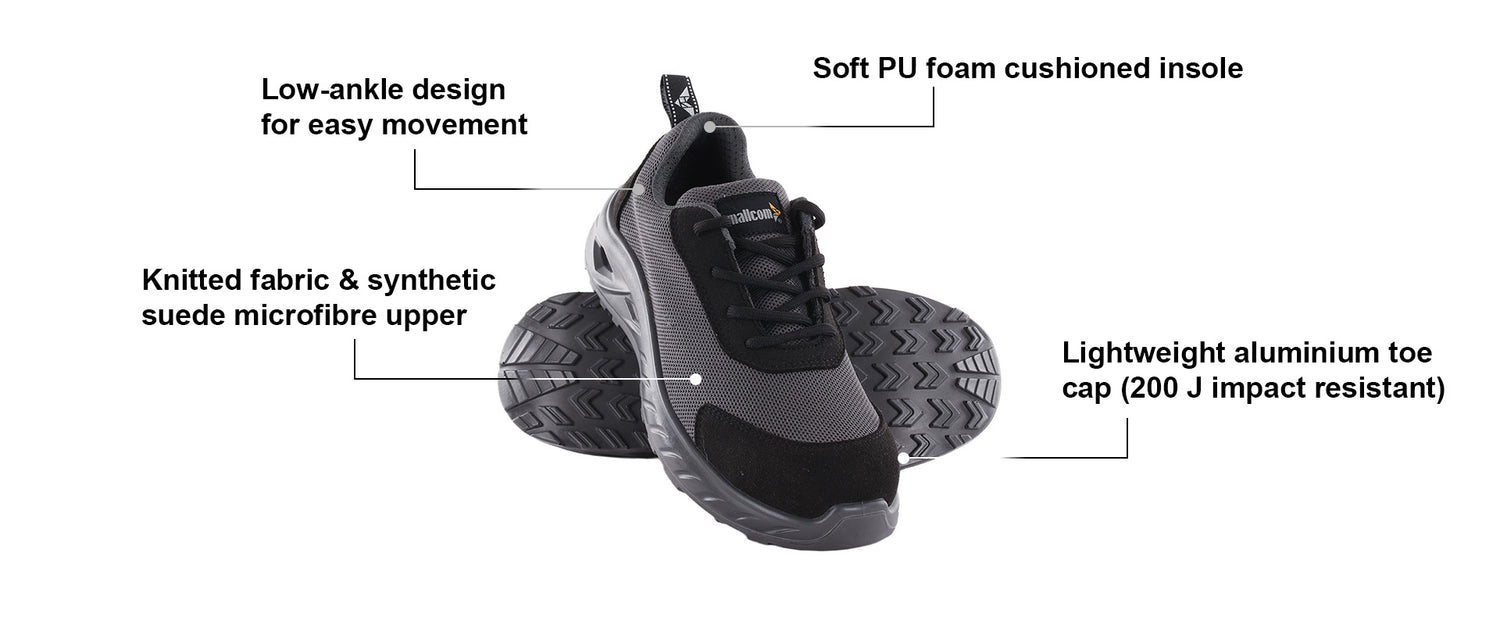 Enhanced Protection & Comfort: Lightweight aluminium toe cap offers 200 J impact protection, while the antistatic insole with soft PU foam and breathable lining improves comfort and safety.