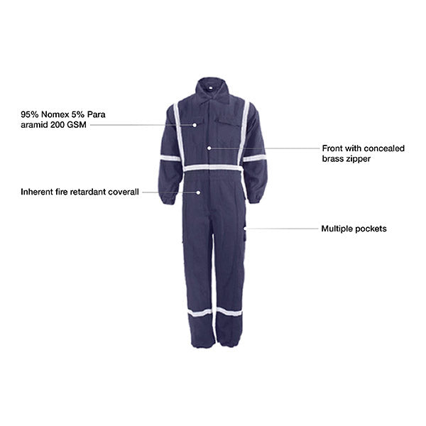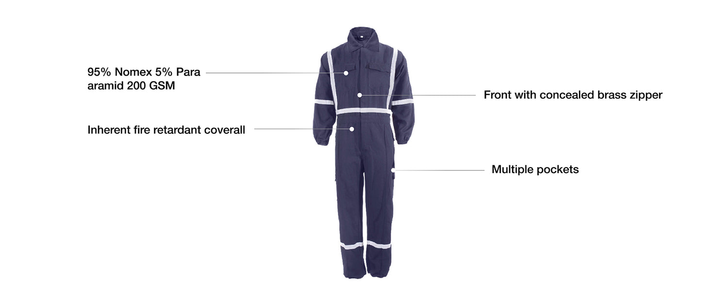 - 95% Nomex 5% Para aramid 200 GSM Inherent fire retardant coverall Front with concealed brass zipper Multiple pockets EN 20471 compliant reflective tape on shoulders, sleeve and legs Provision for knee guard insertion Back waist tightened by elastic Elasticized waist