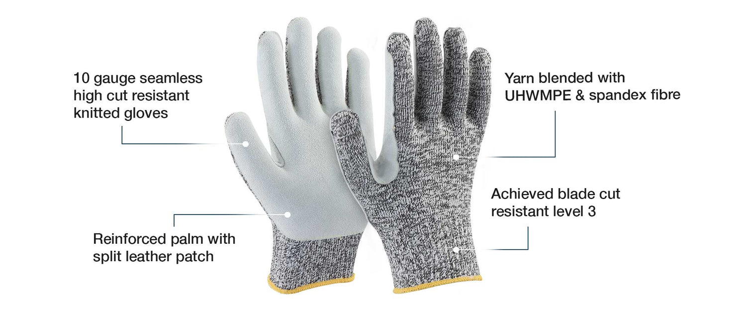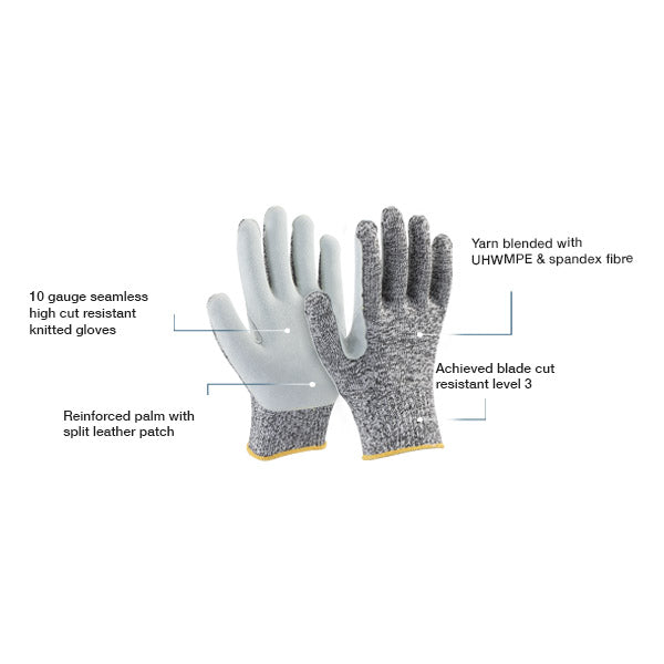 - Performance knitted gloves with 10 gauge seamless high cut resistant knitted gloves with split leather patch