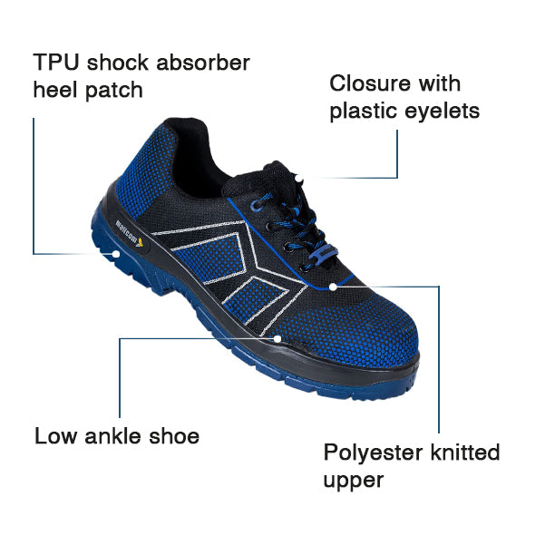 - The upper part of the shoe is made up of knitted polyester with airmesh black collar lining polyurethane direct injected double density sole with 200J impact resistant composite toe cap