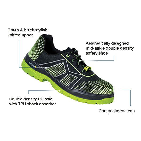 - The upper part of the shoe is made up of knitted polyester with airmesh black collar lining polyurethane direct injected double density sole with 200J impact resistant composite toe cap.