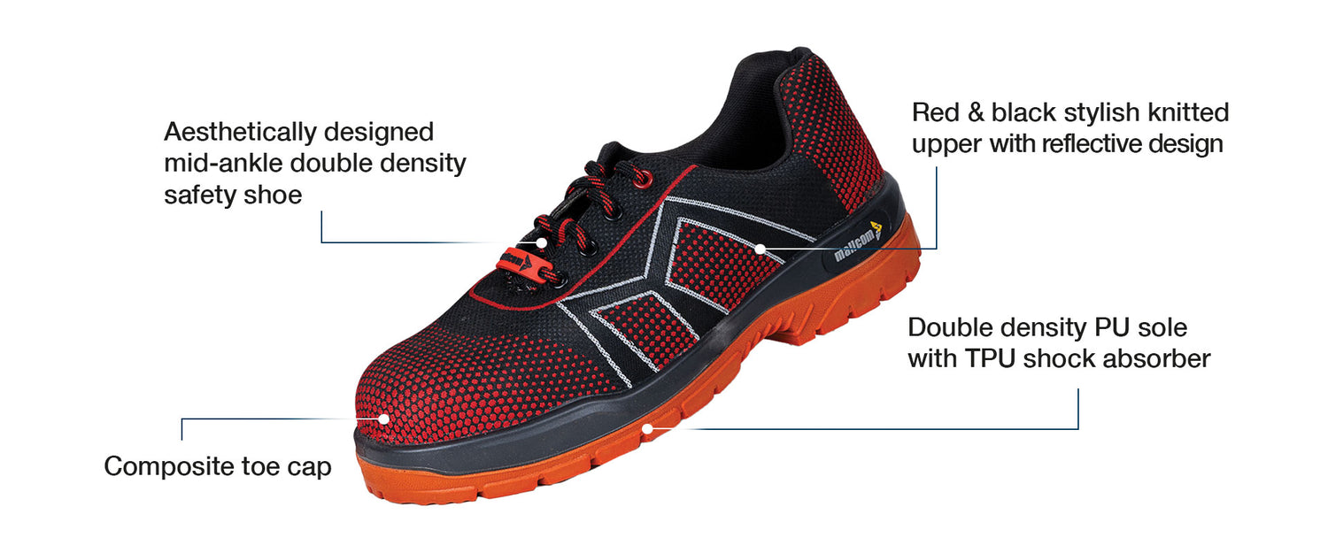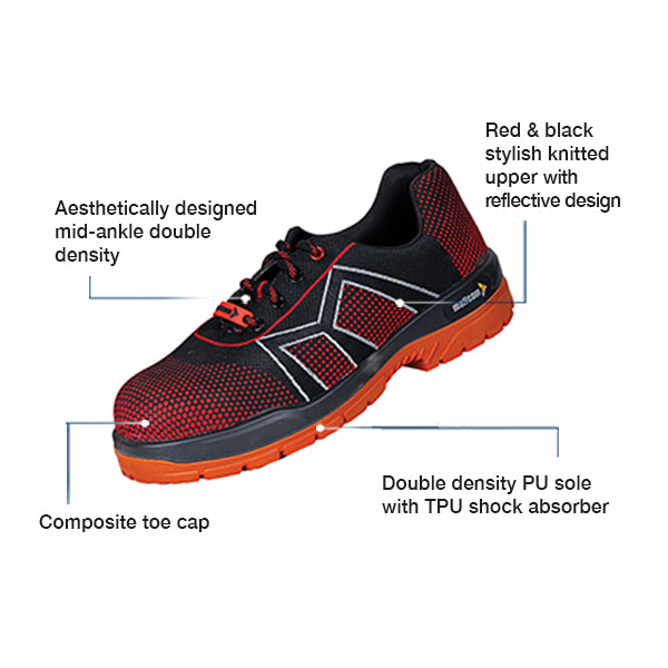 - The upper part of the shoe is made up of knitted polyester with airmesh black collar lining polyurethane direct injected double density sole with 200J impact resistant composite toe cap.