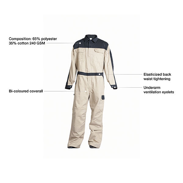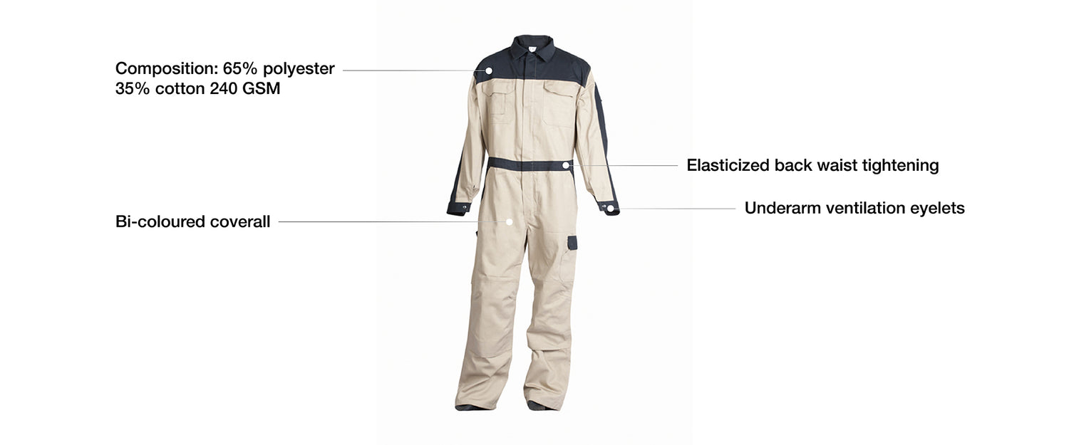 - Composition: Twill, 65% polyester 35% cotton 240 GSM Bi-colored coverall