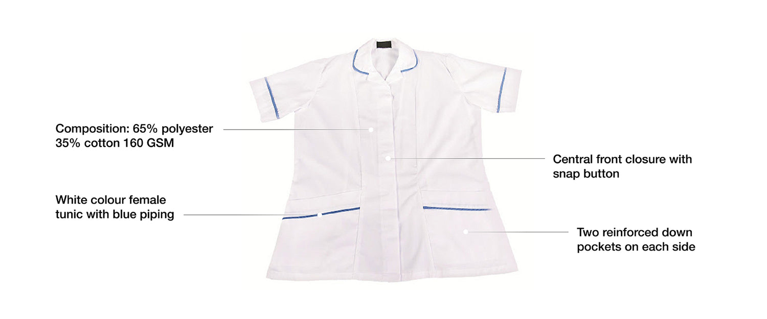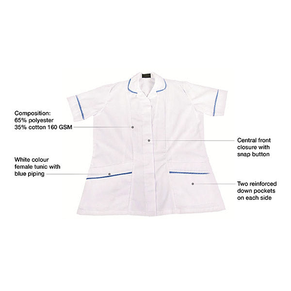 - Composition: 65% polyester 35% cotton 160 GSM white colour female tunic with blue piping