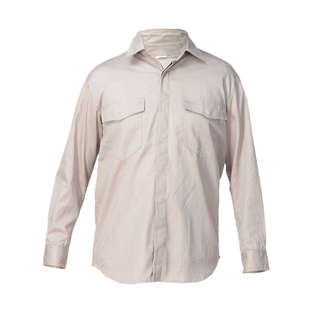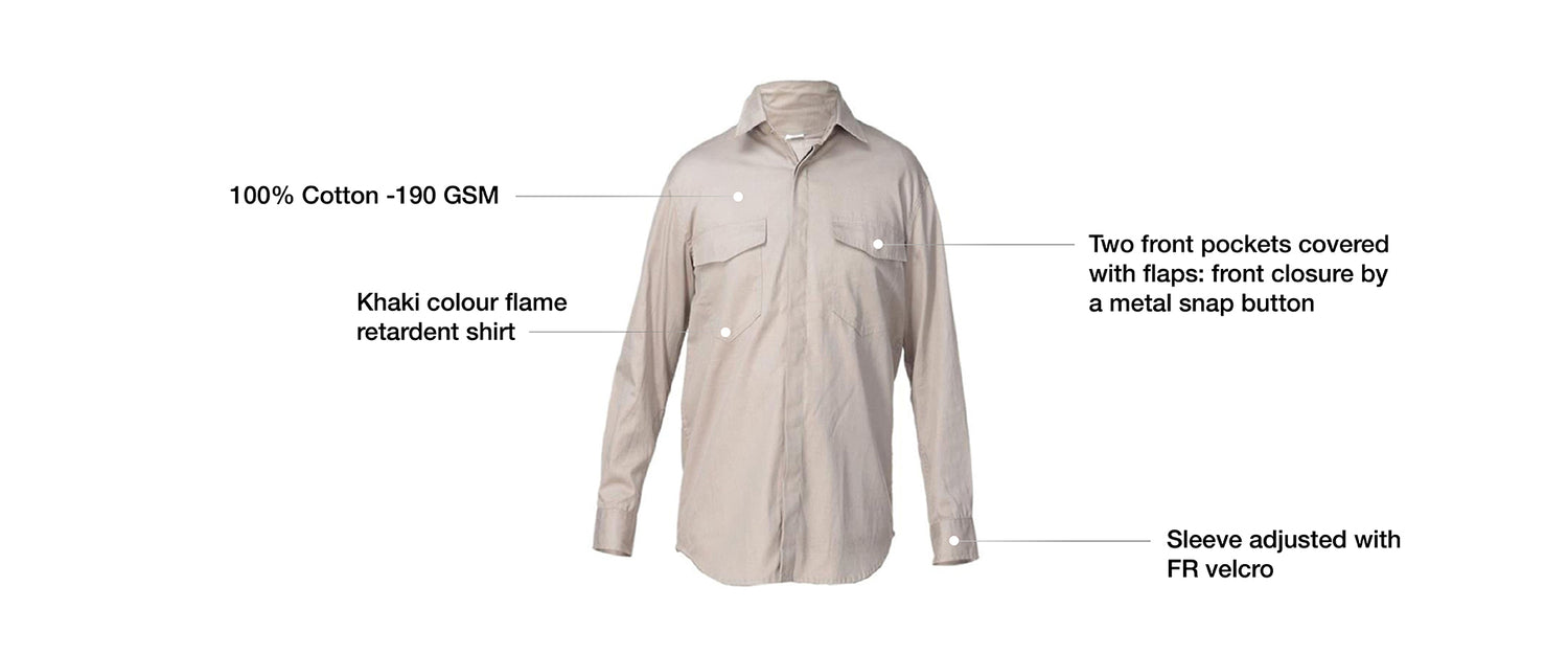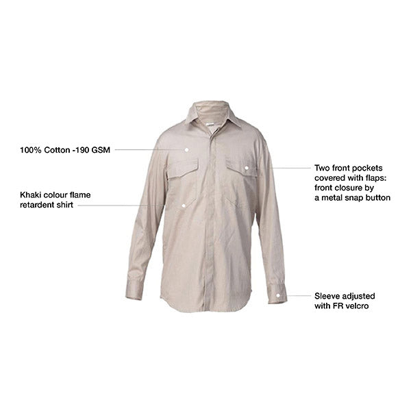 - 100% Cotton -190 GSM Khaki colour flame retardent shirt Two front pockets covered with flaps: front closure by a metal snap button Sleeve adjusted with FR velcro