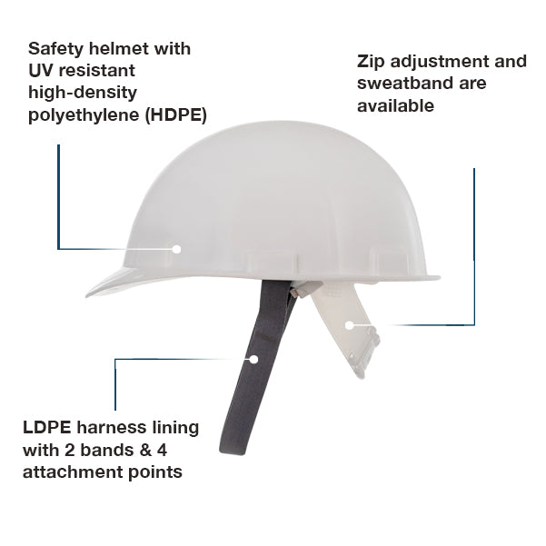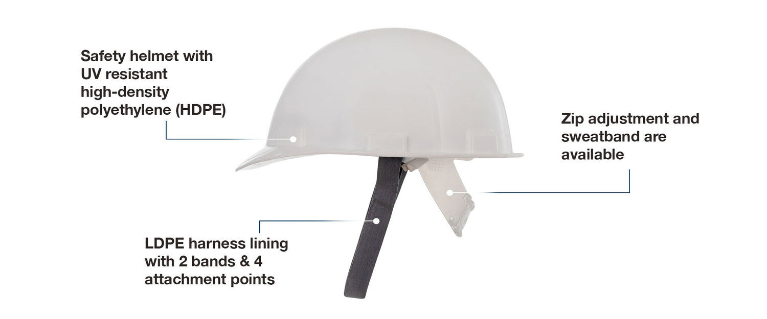 - Mallcom Jasper XIV non-ventilated zip adjusted Industrial safety helmet with PP shell, LDPE harness & chin strap.