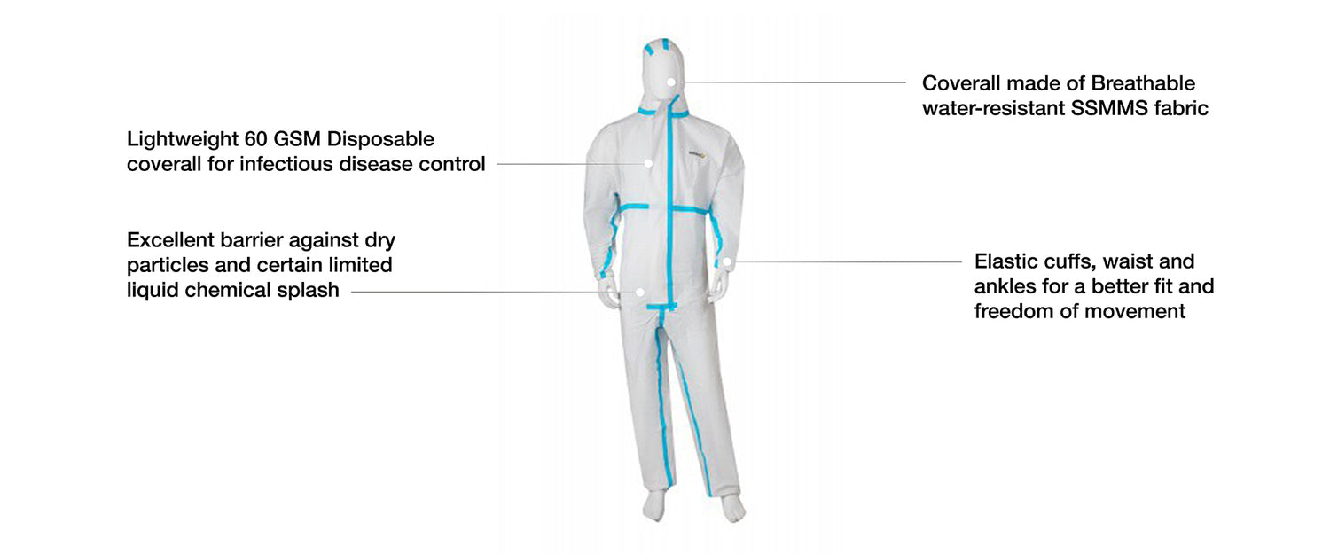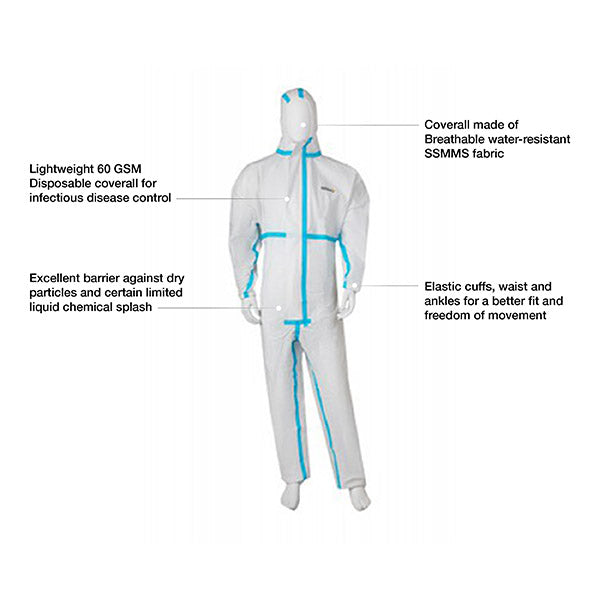 - Light weight 60 GSM outside Seam sealed disposable coverall for infectious disease control and contamination prevention
