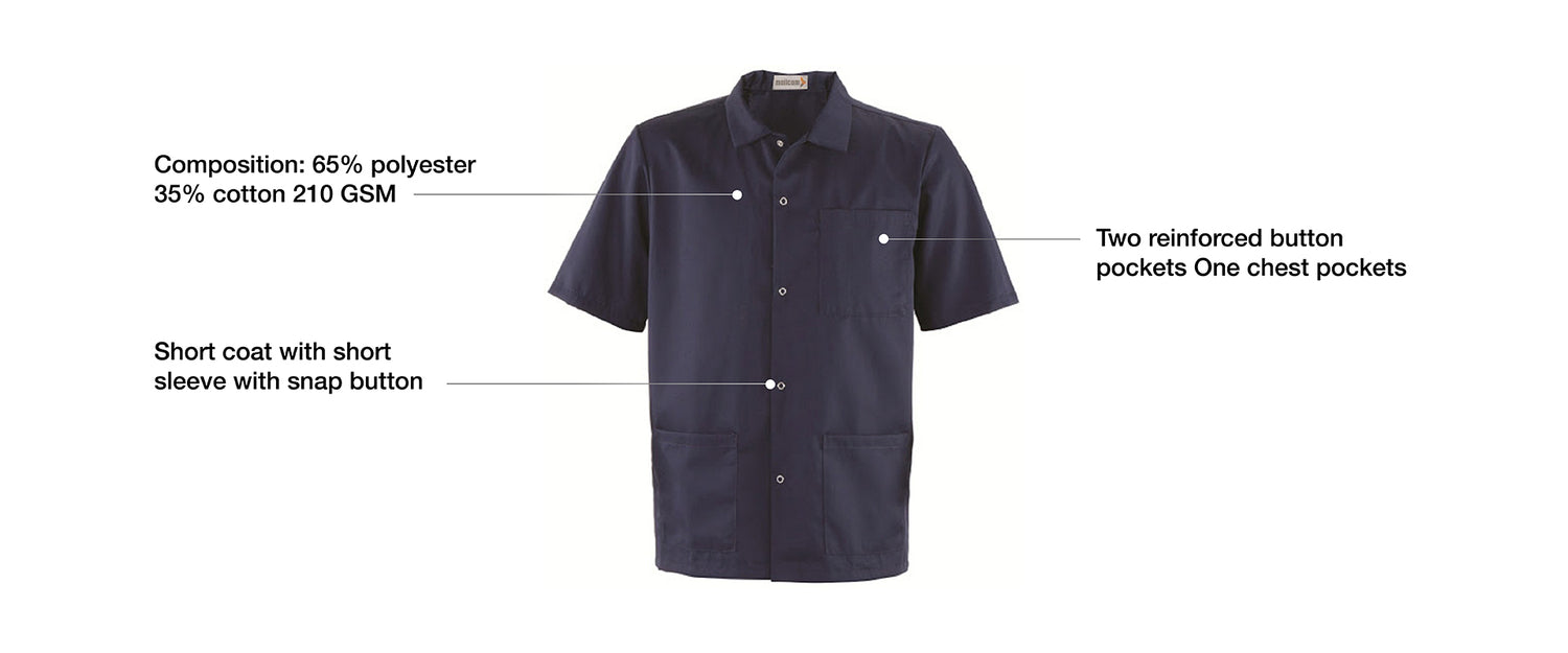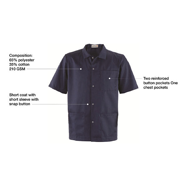 - Composition: 65% polyester 35% cotton 210 GSM Short coat with short sleeve with snap button Two reinforced button pockets One chest pockets