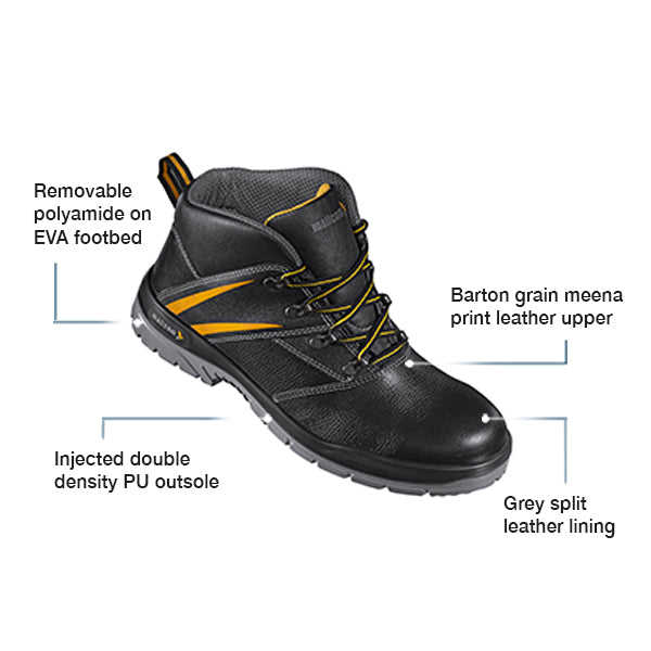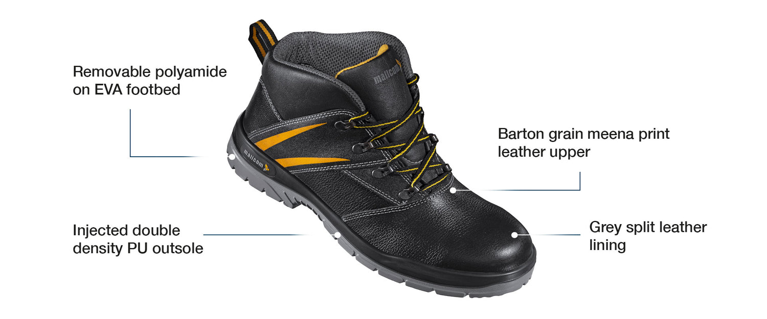 - High ankle leather boot made for all major floor work in industrial construction or workfloors to protect from hazards like falling objects or heavy loads or working with sensitive equipments.