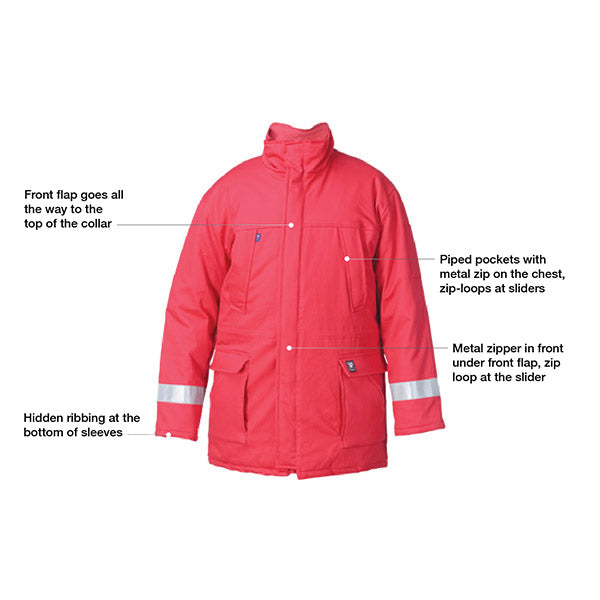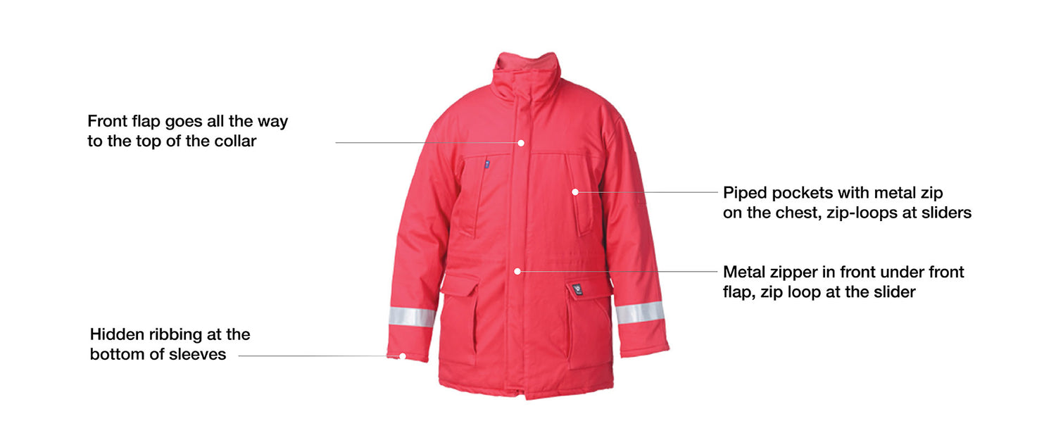 - Insulated flame retardant parka with button and zip closure fastener