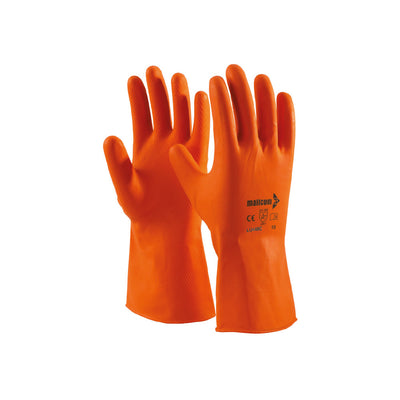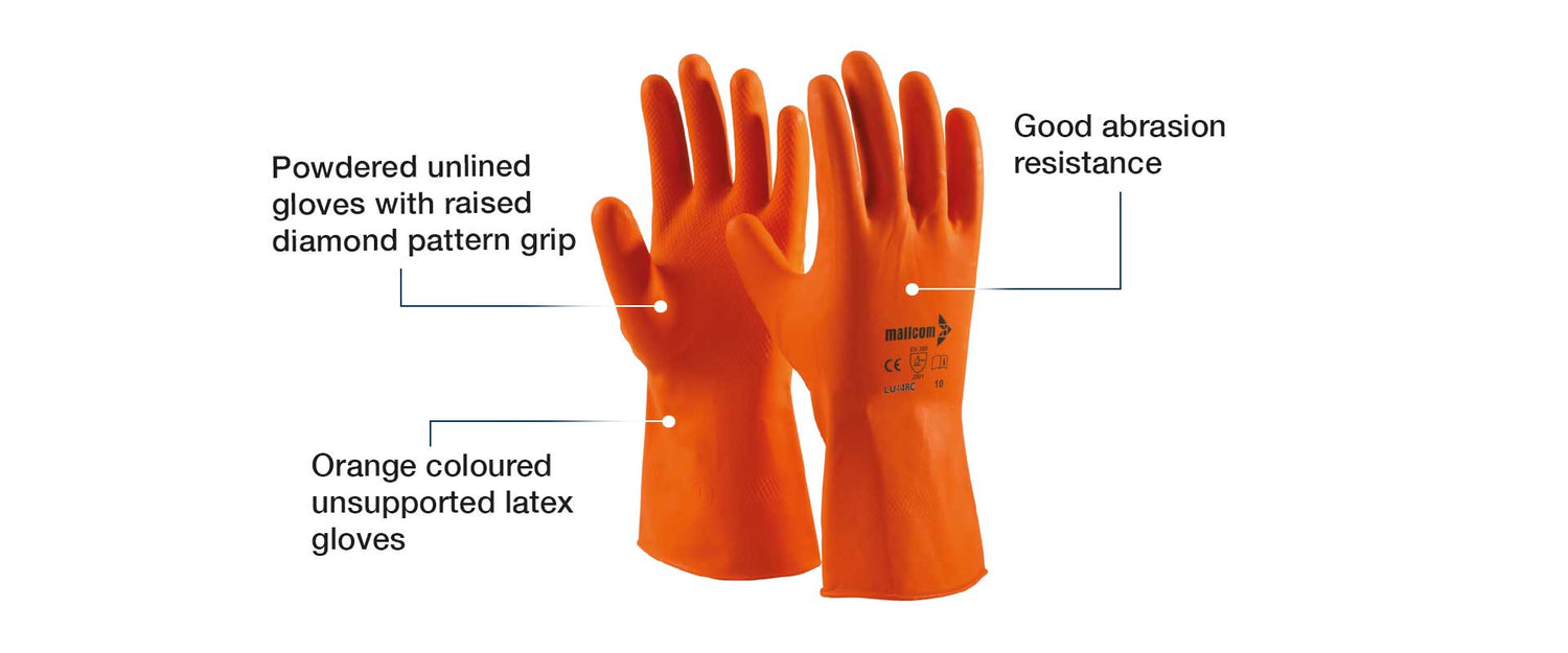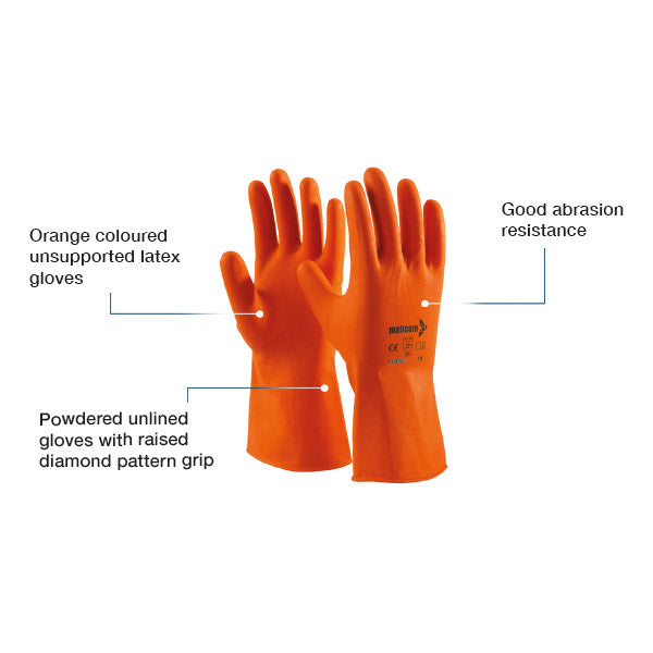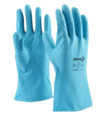 Unsupported blue latex rubber un lined gauntlets with Raised diamond grip pattern, available in four nominal hand sizes.