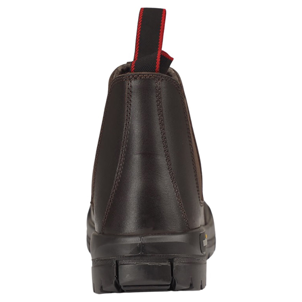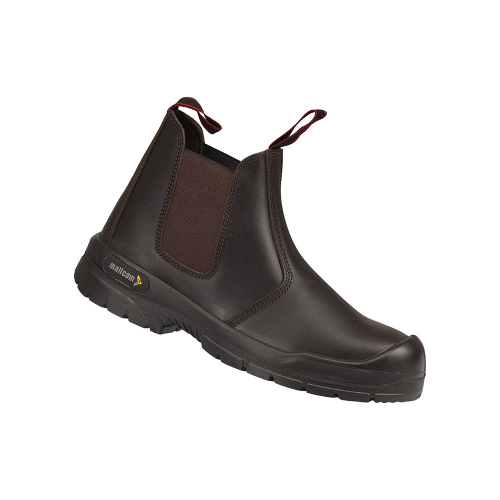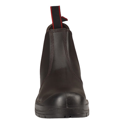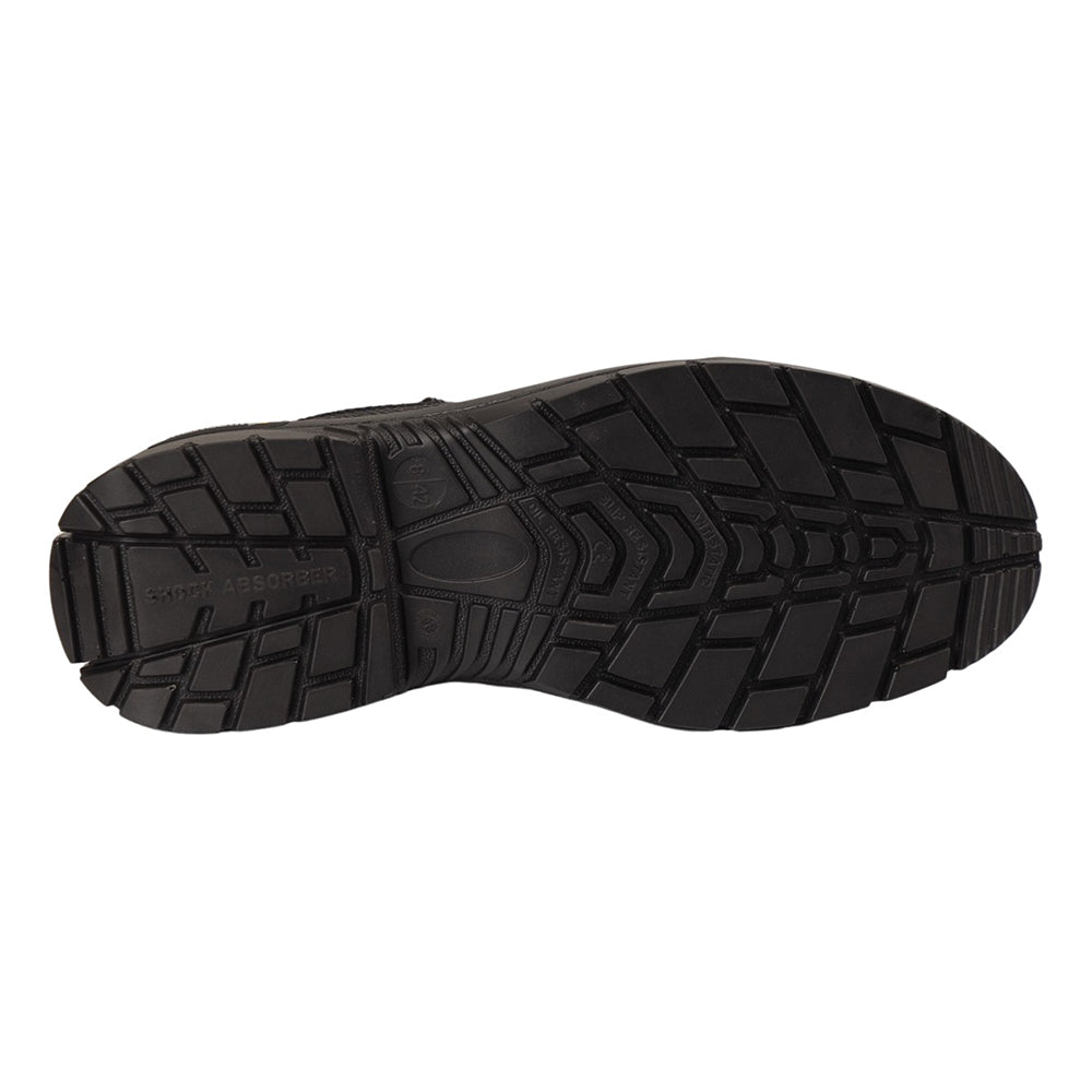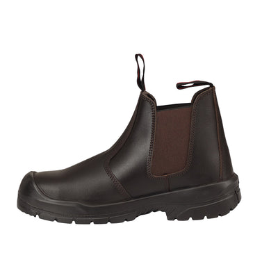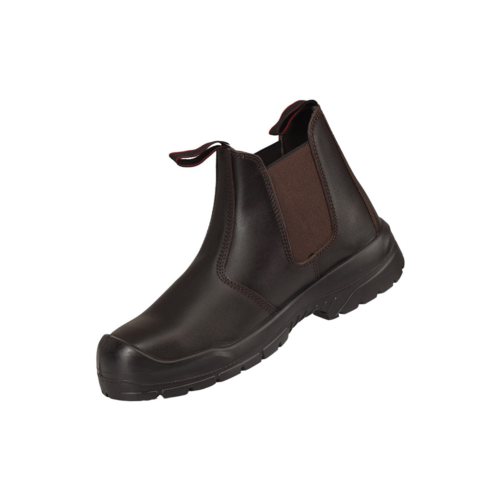 Ankle safety footwear with corrected grain leather upper, double density PU outsole.