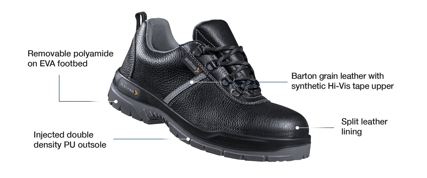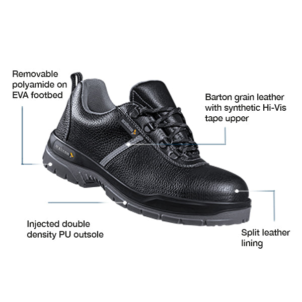 - Low ankle leather boot made for all major floor work in industrial construction or workfloors to protect from hazards like falling objects or heavy loads or working with sensitive equipments.