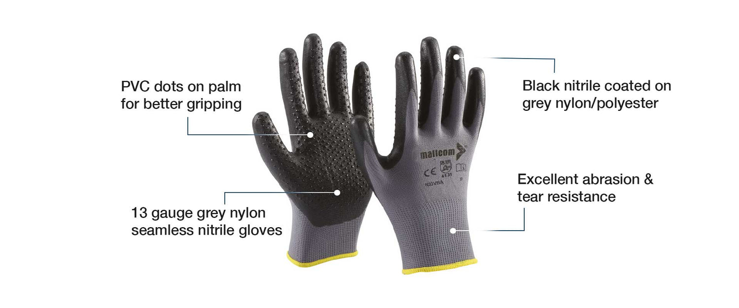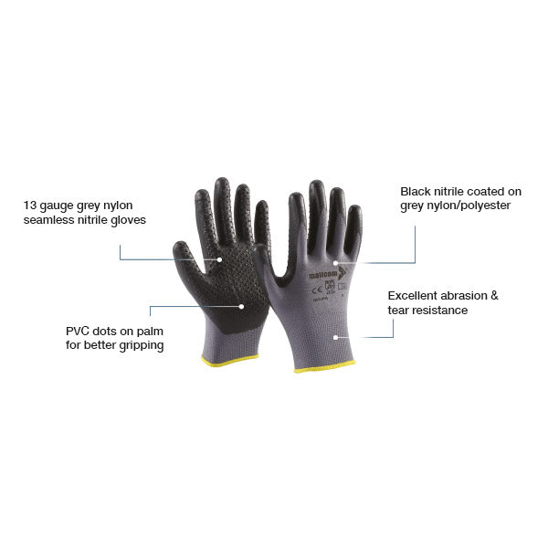 - Black nitrile coated on grey nylon/polyester
