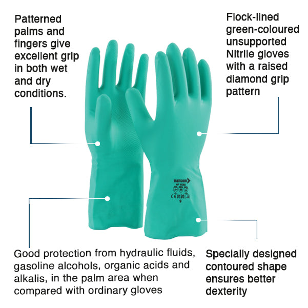 SUPERIOR PROTECTION AND GRIP - The flock-lined green nitrile gloves offer exceptional protection against a range of substances, including hydraulic fluids, gasoline, alcohols, organic acids, and alkalis. Their raised diamond grip pattern ensures excellent grip in wet or dry conditions. The contoured shape enhances dexterity, making them ideal for various tasks, from industrial work to outdoor activities