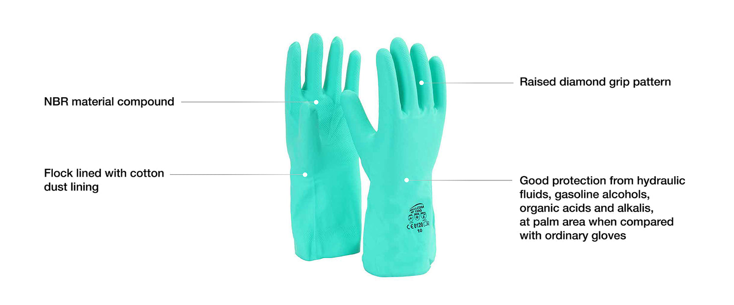 NBR MATERIAL COMPOUND - Crafted from NBR material compound, these gloves are oil-resistant, water-resistant, and resistant to chemical splashes. This ensures durability and longevity even in demanding environments. The material's resilience against various substances makes these gloves a reliable choice for tasks where protection is paramount, such as in industrial settings.