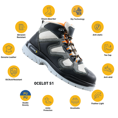 - SOLE: Abrasion Resistant, Antiskid, Fuel Resistant, Shock Absorbent OLIVER Double Density PU sole. Midsole Black, Out Sole Grey