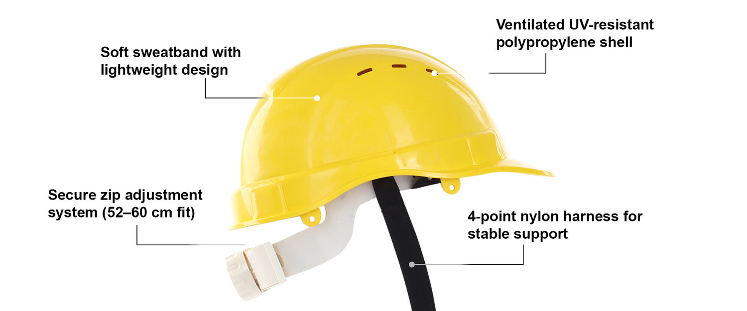 - Durable Ventilated Protection: Safety helmet made from strong polypropylene (PP) shell with ventilation, designed to provide reliable head protection and improved airflow in industrial environments.