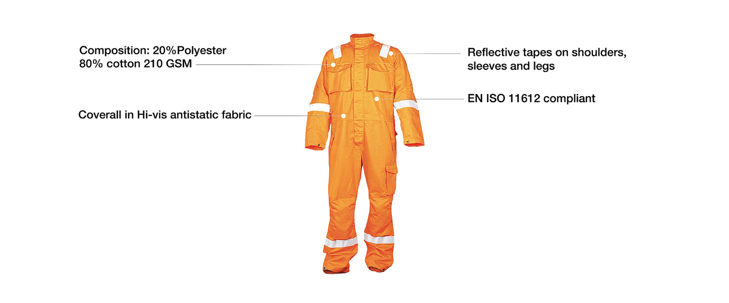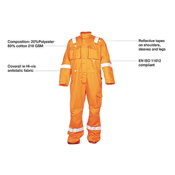 - Composition: 20%Polyester 80% cotton 210 GSM Coverall in Hi-vis antistatic fabric Reflective tapes on shoulders, sleeves and legs EN ISO 11612 compliant Multi-utility pockets Brass zippers and press buttons for closures Below pockets for extra storage space