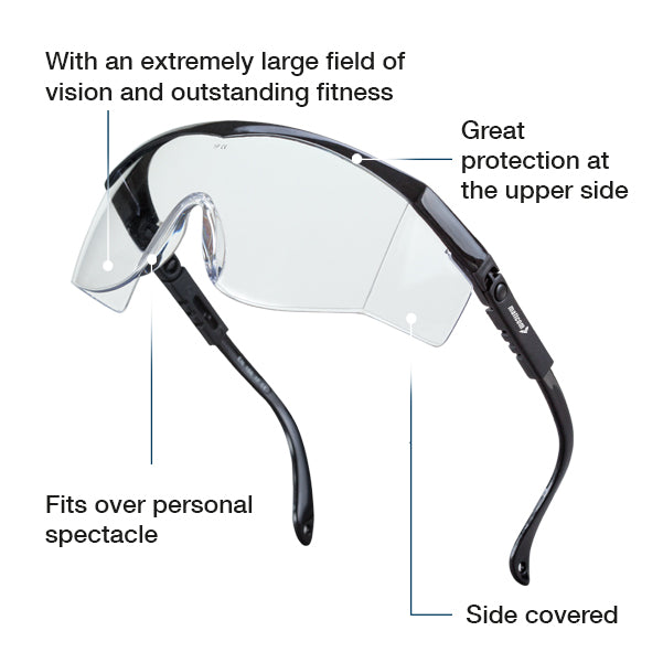 - Spectacles having clear polycarbonate glasses with adjustable and tilting nylon arms.