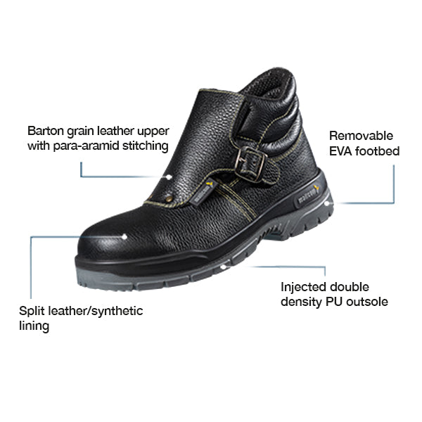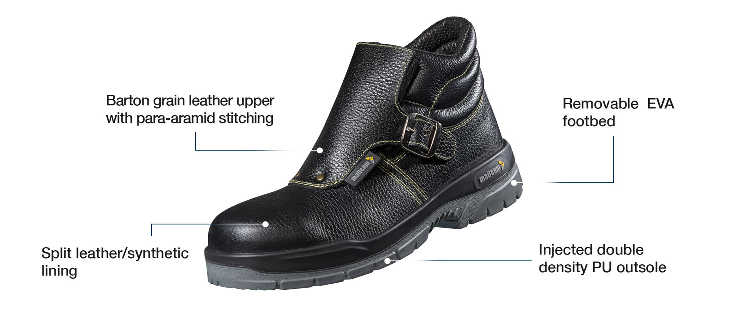 - High ankle leather boot made for all major floor work in industrial construction or workfloors to protect from hazards like falling objects or heavy loads with weilding applications.