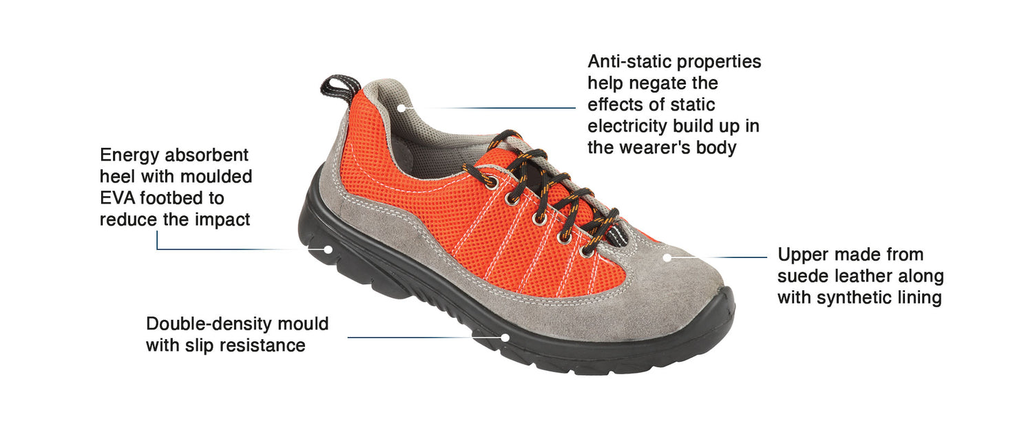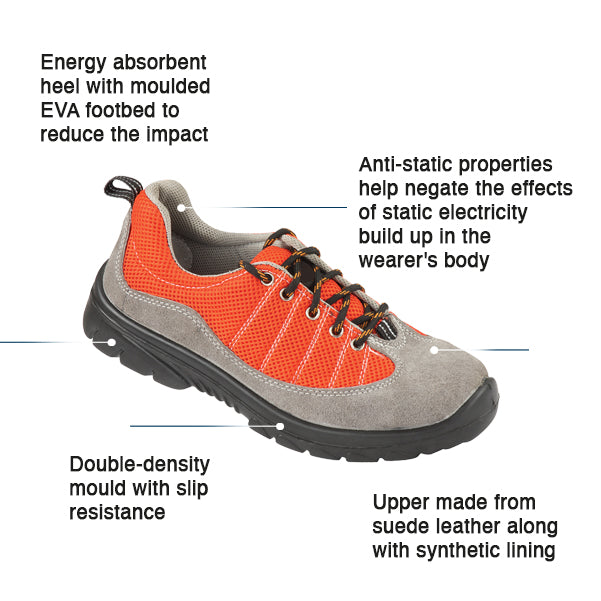 - Mallcom Ragini suede leather and nylon orange upper low ankle steel toe cap double density PU sole safety shoe for women
