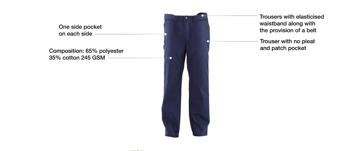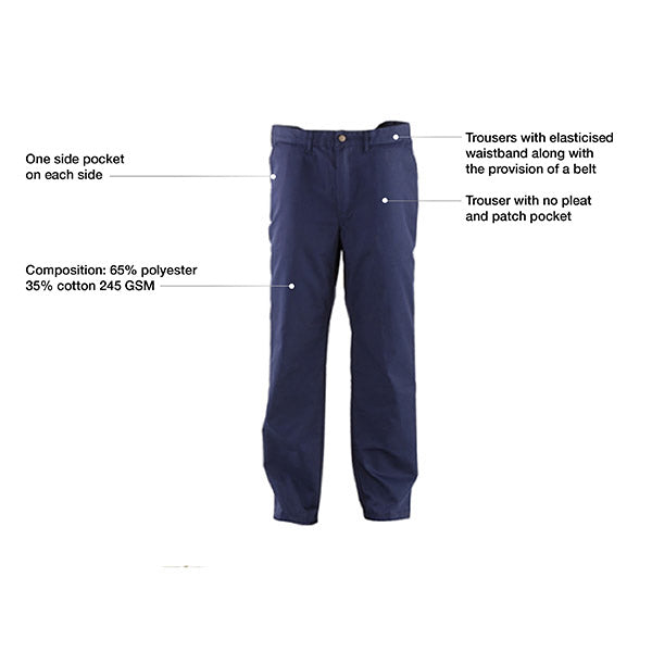- Composition: 65% polyester 35% cotton 245 GSM Trouser with no pleat and patch pocket Trousers with elasticised waistband along with the provision of a belt One side pocket on each side CFC zipper