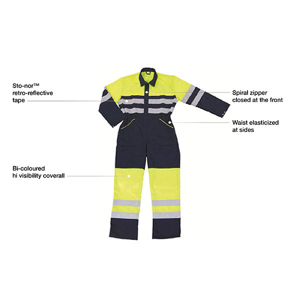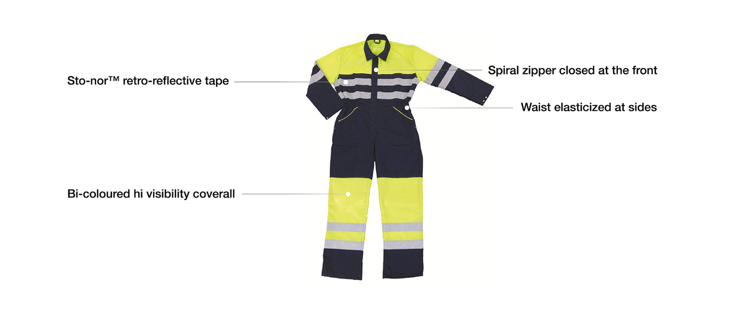 - Sto-nor™ retro-reflective tape Bi-coloured hi visibility coverall Spiral zipper closed at the front 50 mm wide double band reflective tape. Waist elasticized at sides One zipped chest pocket Two patch pockets at waist