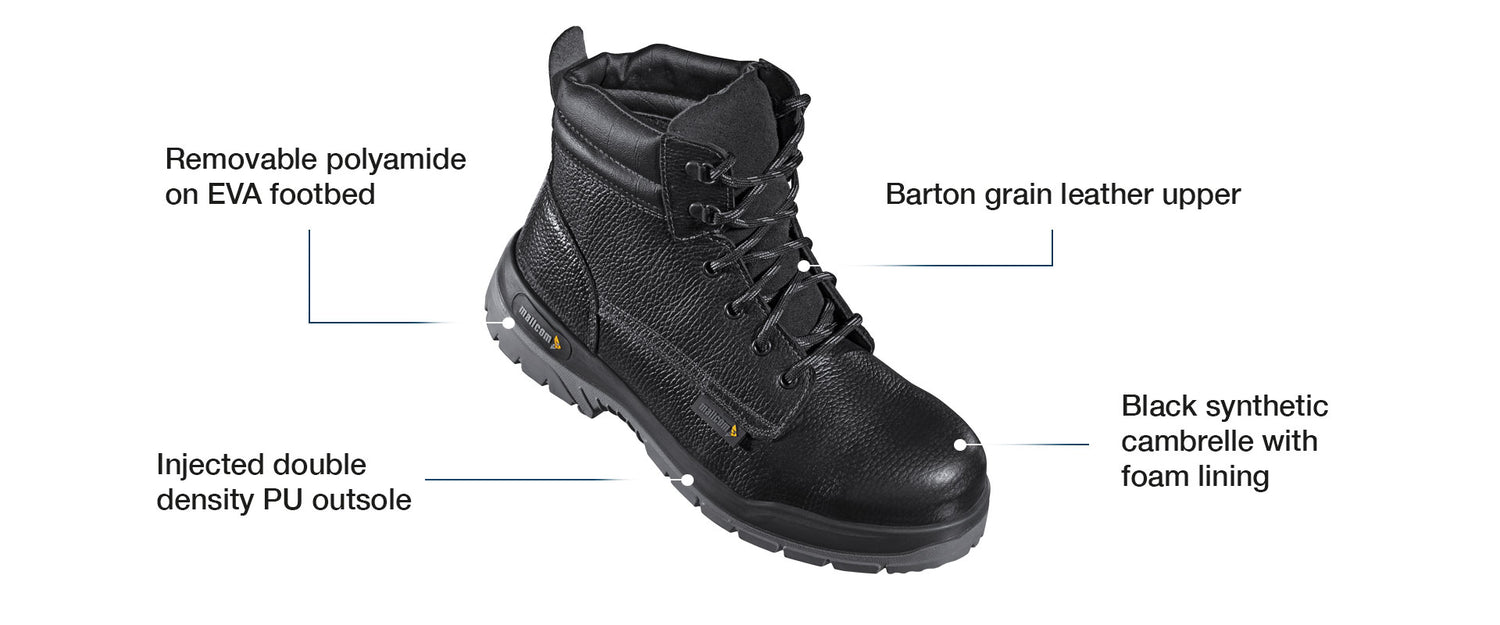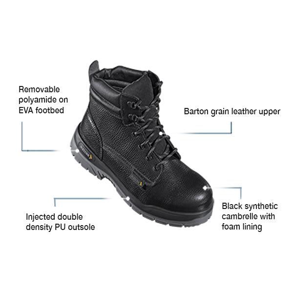 - High ankle leather boot made for all major floor work in industrial construction or workfloors to protect from hazards like falling objects or heavy loads or working with sensitive equipments.
