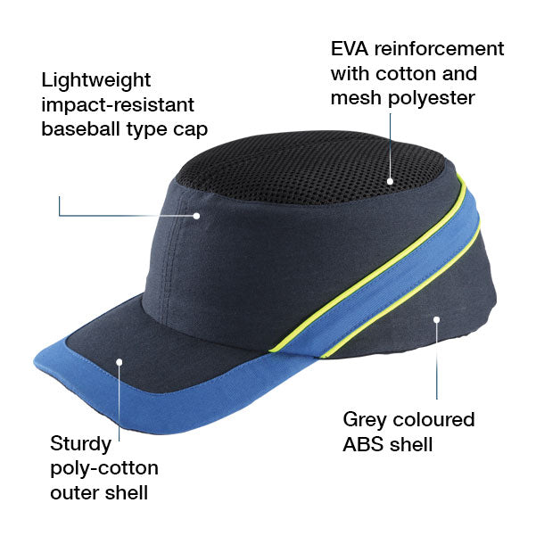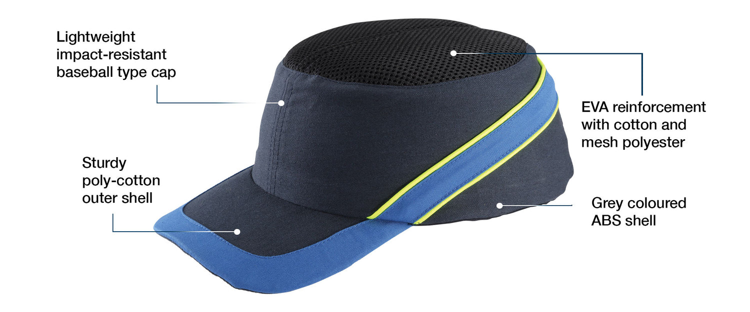 - The bump cap offers both style & comfort, consists of HDPE material covered on the exterior with cotton & mesh polyester and padded with EVA on the inner side of the shell to absorb shocks.