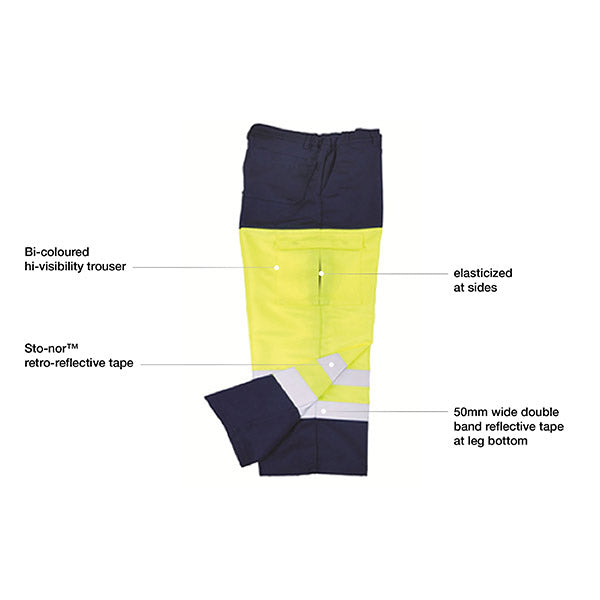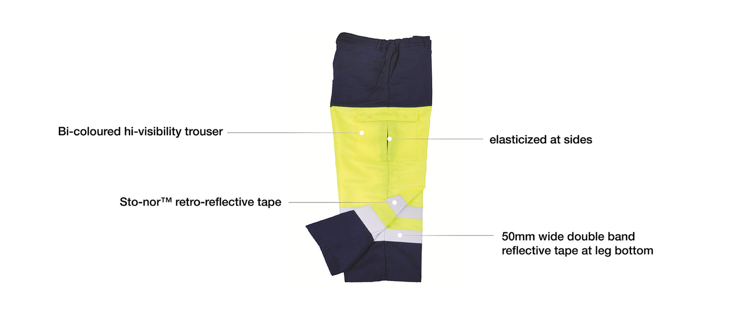 - Sto-nor™ retro-reflective tape Bi-coloured hi-visibility trouser 50mm wide double band reflective tape at leg bottom elasticized at sides Two sides pocket One patch pocket at back Leg pocket with flap