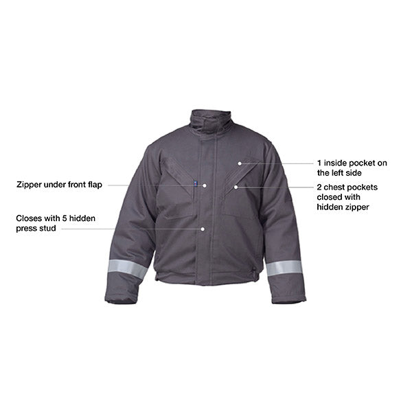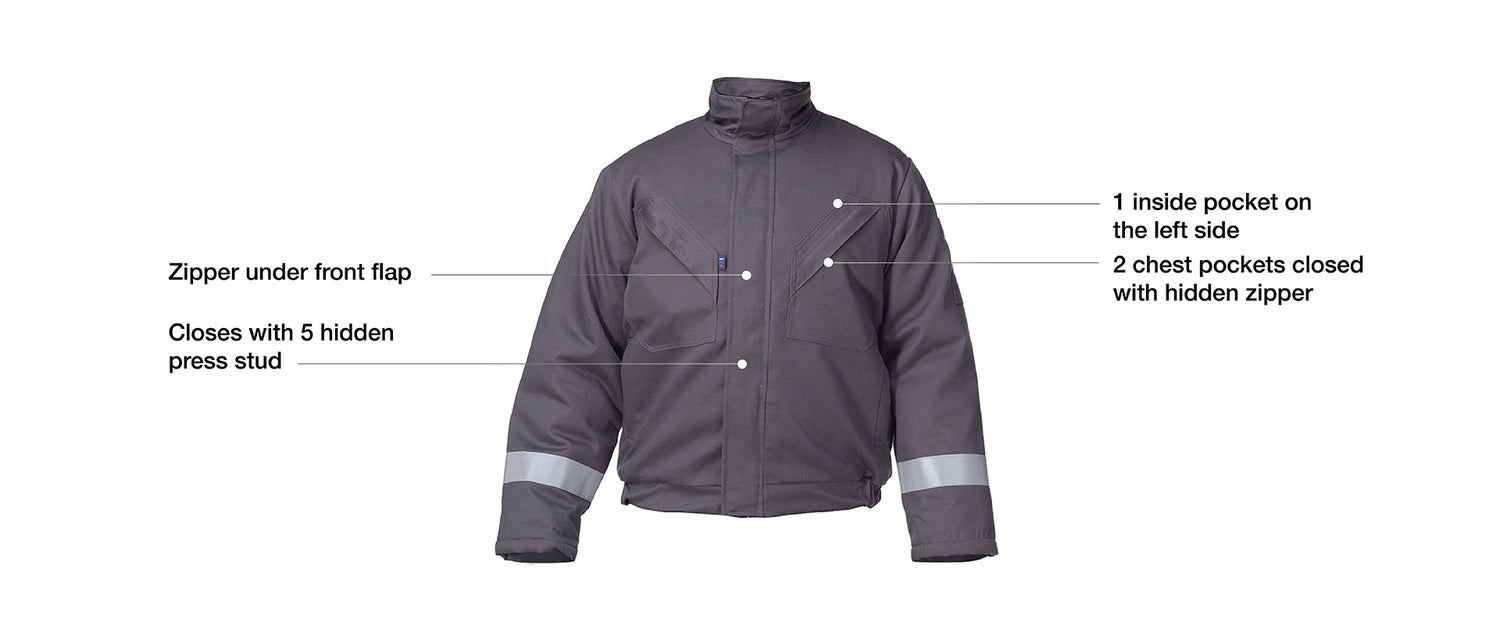 Flame-resistant Insulated Jacket for protection of industrial personnel against short-duration thermal exposures from fire.